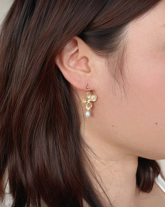 MOANA - Boucles d’oreilles mariage fleur dorée et et perle goutte blanche Parure Bijoux Mariage chic Cadeau Noël pour elle