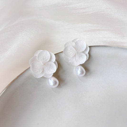 PAULINE - Boucles d'oreille mariage fleur d'hortensia stabilisé blanc et perle Bijoux Mariage