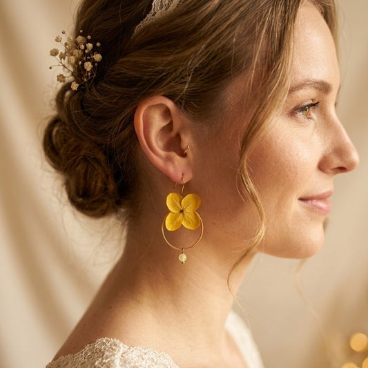 OLIVIA JAUNE - Boucles d'oreille mariage créoles fleur stabilisés jaune et perle jaune clair ou vert Bijoux Demoiselle d'honneur