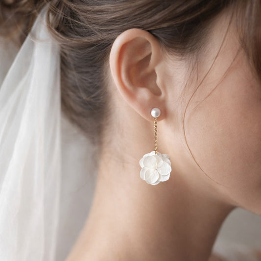 LARA PEARL - Boucles d'oreilles pendantes pour mariage en hortensias stabilisés blanc et perle Bijoux Mariage Bijoux Mariée poétique et chic