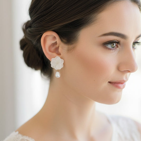 NEYLIA - Boucles d'oreilles mariage fleur d'hortensia stabilisé blanc et perle goutte Parure Bijoux Mariage Bijoux Mariée