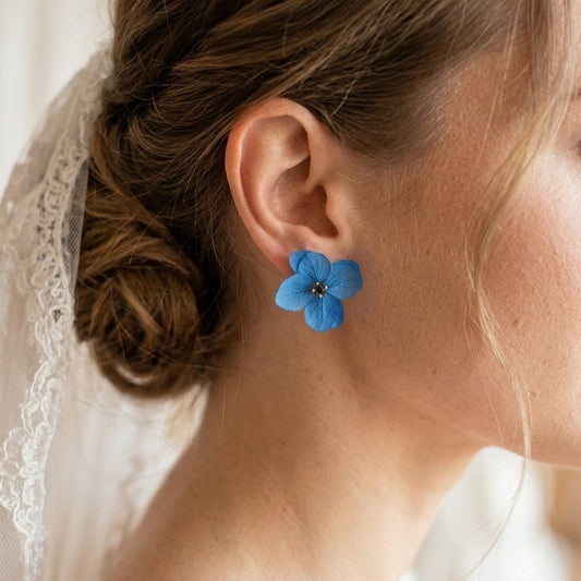 SERENA BLEU – Boucles d’oreilles pour mariée en fleurs stabilisées bleues et clous martelés chic Bijoux pour mariée poétique et chic