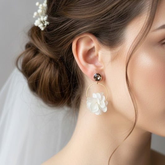 TESSA CLIPS - Clips d'oreilles pour mariée aux oreilles non percées créoles en fleur d'hortensias stabilisé blanc Bijoux mariage bohème chic