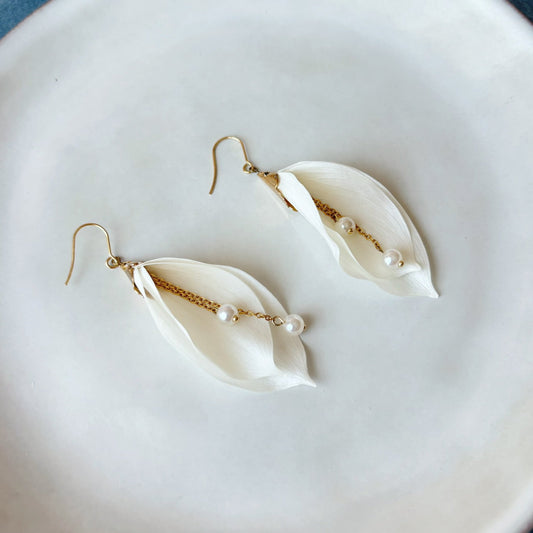 Edition Limitée - CALLA PERLE - Boucles d'oreilles mariage fleur d'arum feuille stabilisée blanche et perles pendantes Bijoux mariage chic
