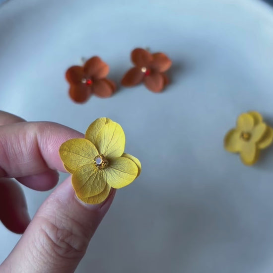 Boucles d’oreilles à clous en hortensias stabilisés jaune ou terracotta, sublimées par un strass scintillant. Raffinées et naturelles, elles illuminent élégamment une tenue de mariage.