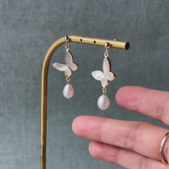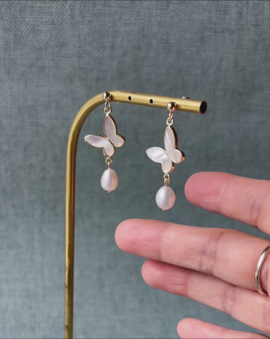 Ces boucles d’oreilles raffinées, composées d’un pendentif papillon nacré et d’une perle naturelle, apportent une touche de lumière à chaque tenue.